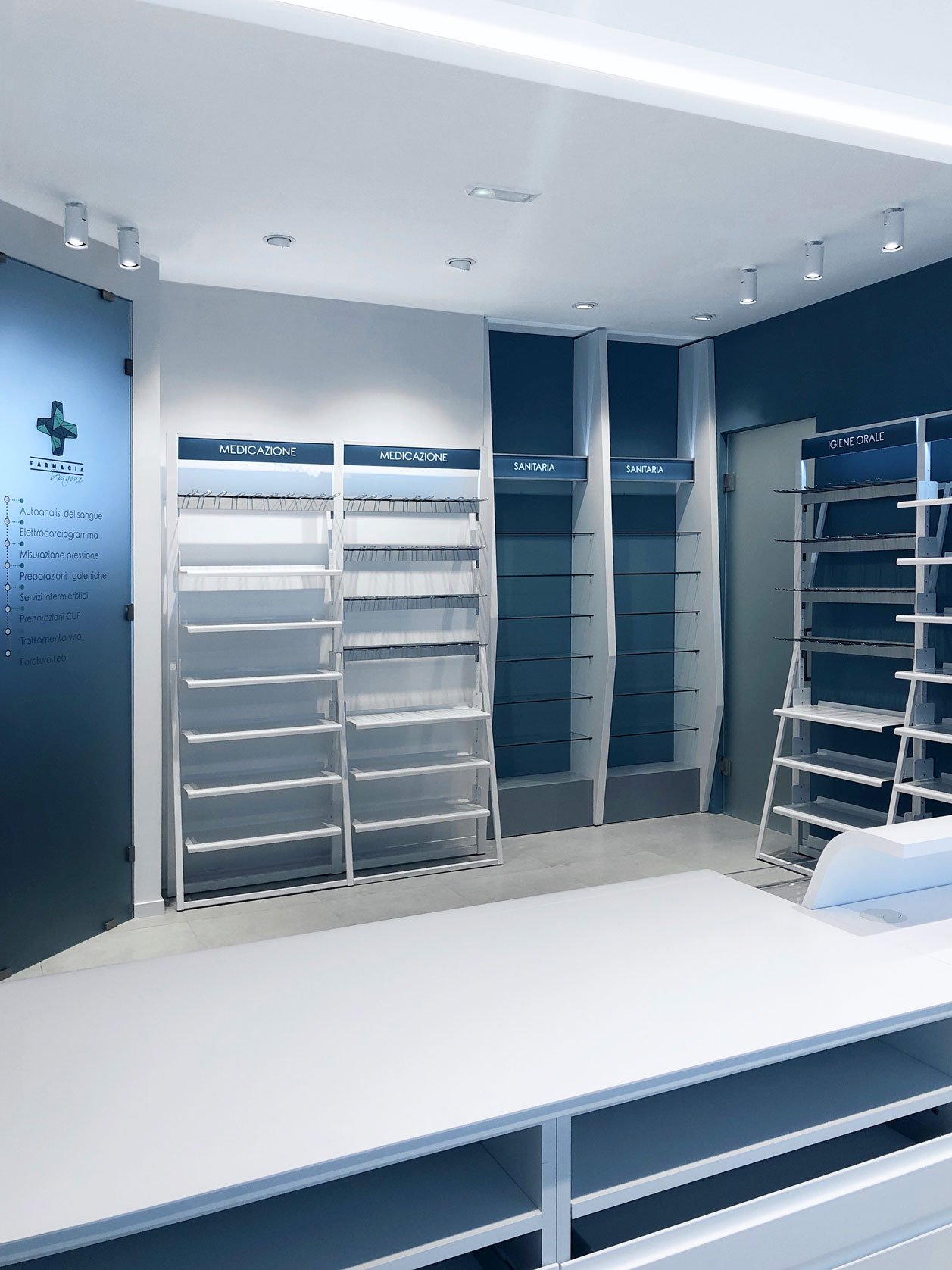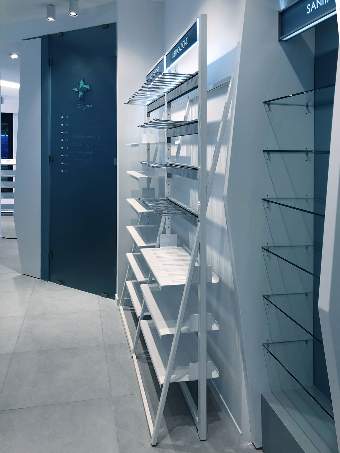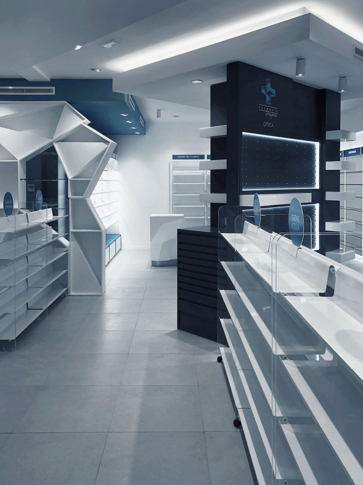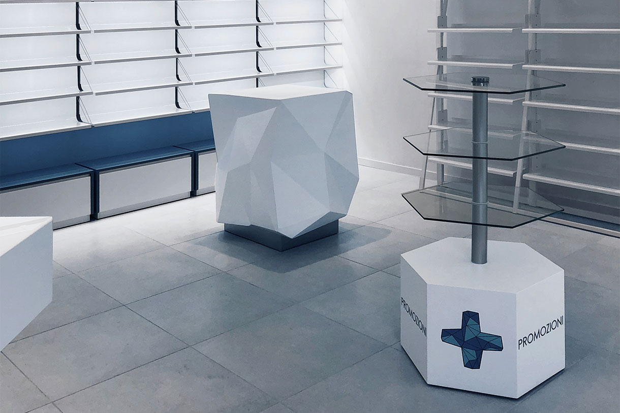 The client’s specific desire to showcase innovative and futuristic forms and, above all, to use unconventional materials in an environment related to health and wellness, gave birth in 2019 to this complete setup of over 150 square meters for a well-known pharmacy on the outskirts of Rome. The main challenge is, as always, to mix different materials not only within the same space, but as different components of the same element. Characteristic features are the polygonal geometries designed with CAD systems and obtained in lacquered MDF with multilayer substructures, the extensive use of painted iron, the combination in the same structures of metal, plastic and glass materials, as well as noble materials such as Corian. The deep lighting study then highlights the cold and almost monochromatic shades, enhancing the overall perception of cleanliness of the entire environment.