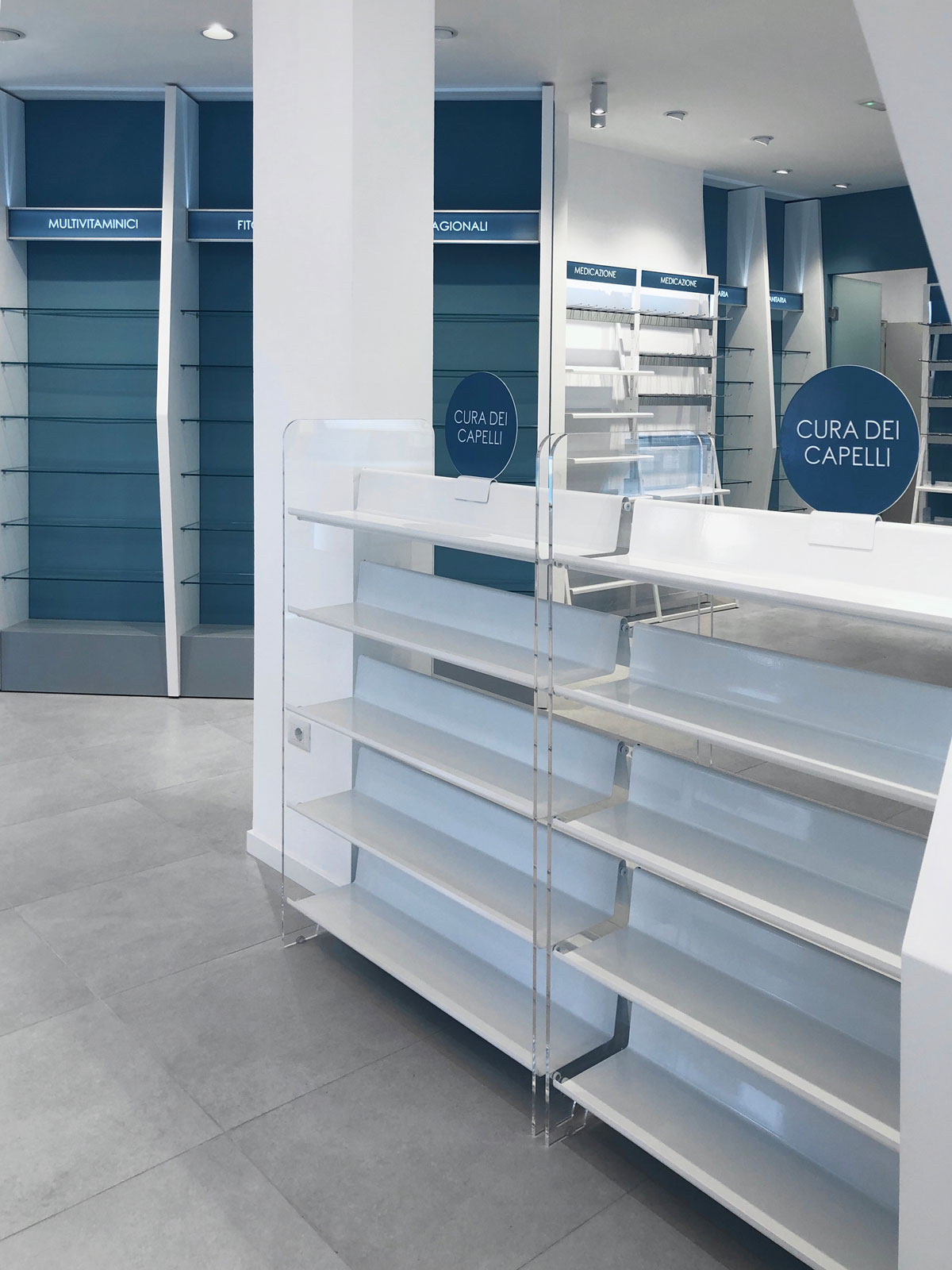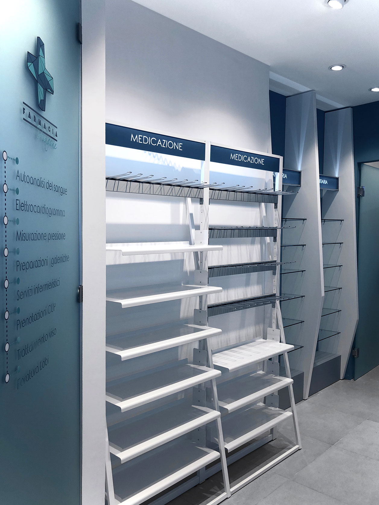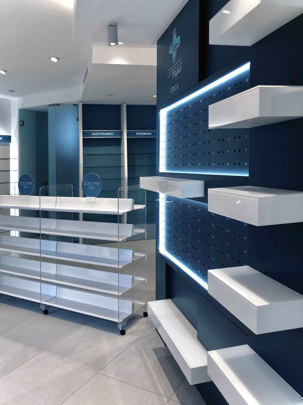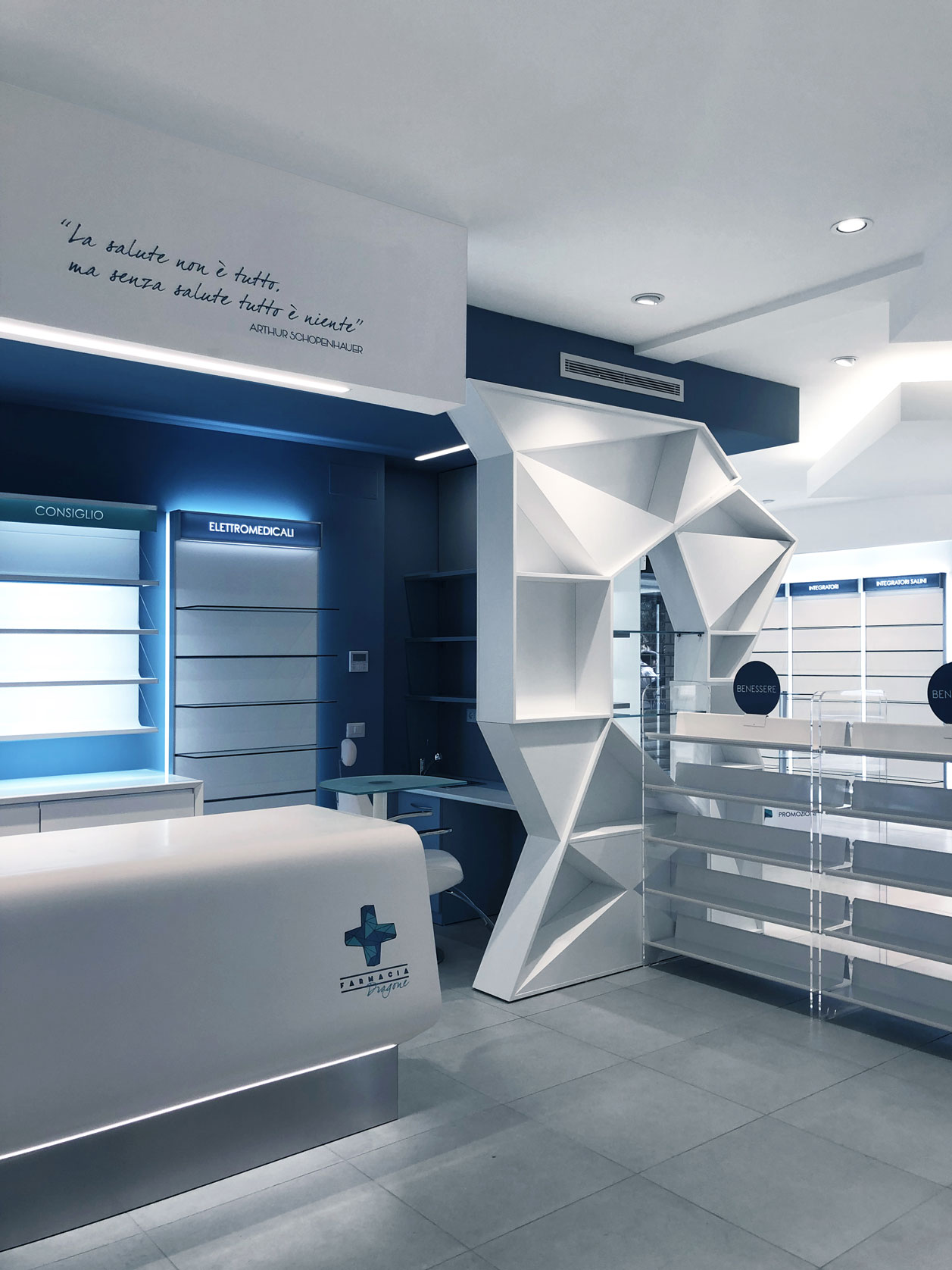 The client’s specific desire to showcase innovative and futuristic forms and, above all, to use unconventional materials in an environment related to health and wellness, gave birth in 2019 to this complete setup of over 150 square meters for a well-known pharmacy on the outskirts of Rome. The main challenge is, as always, to mix different materials not only within the same space, but as different components of the same element. Characteristic features are the polygonal geometries designed with CAD systems and obtained in lacquered MDF with multilayer substructures, the extensive use of painted iron, the combination in the same structures of metal, plastic and glass materials, as well as noble materials such as Corian. The deep lighting study then highlights the cold and almost monochromatic shades, enhancing the overall perception of cleanliness of the entire environment.