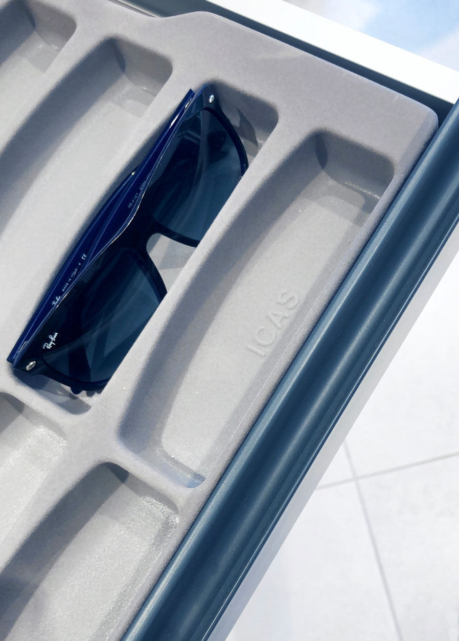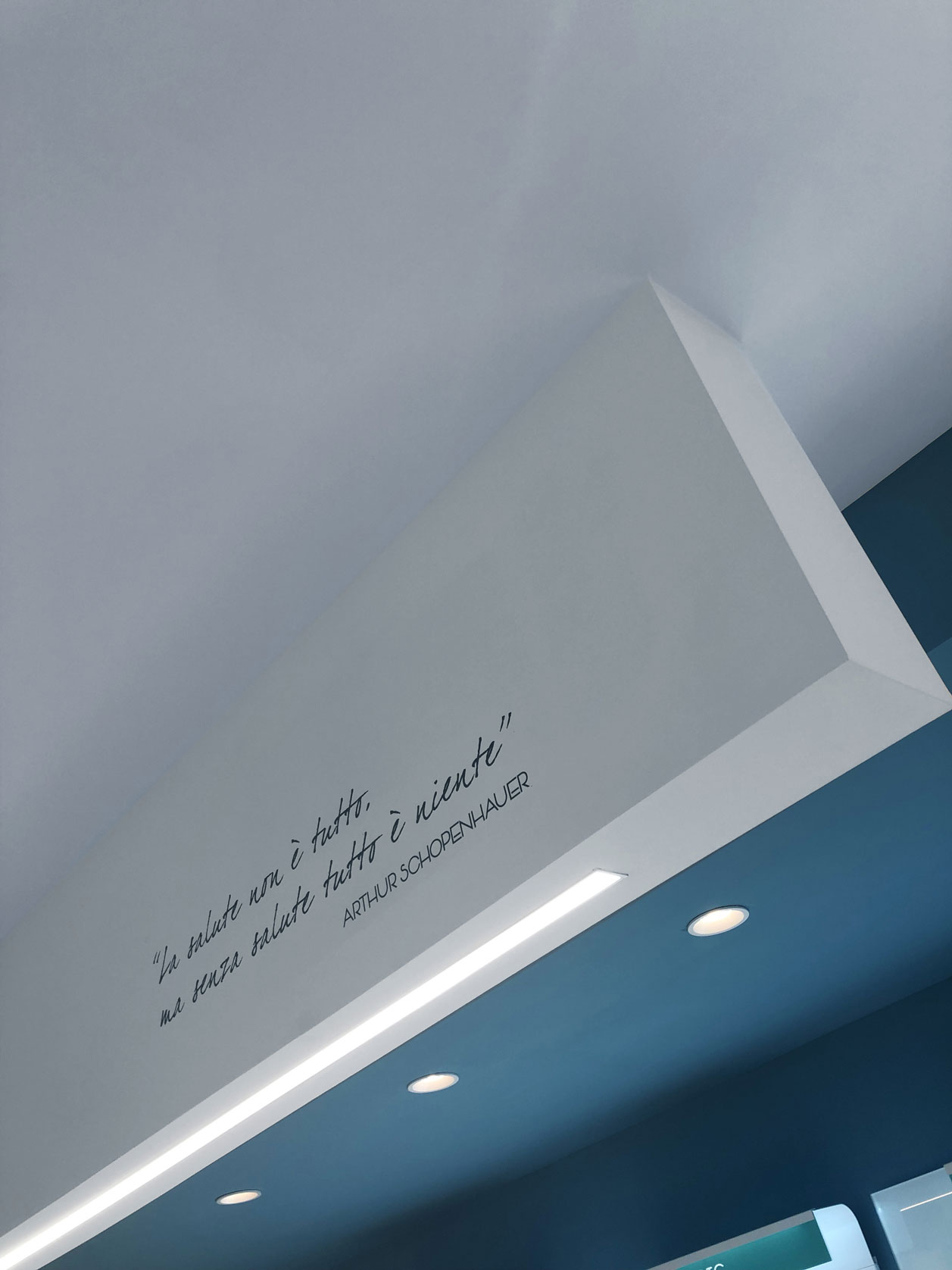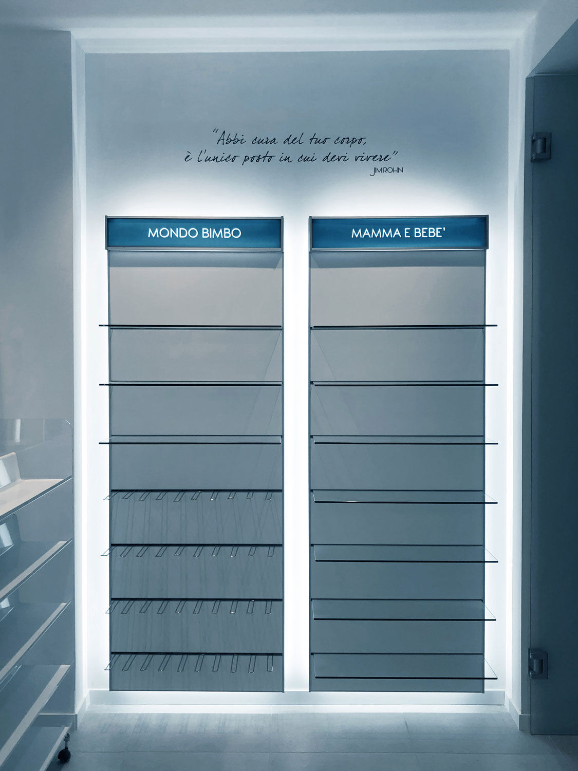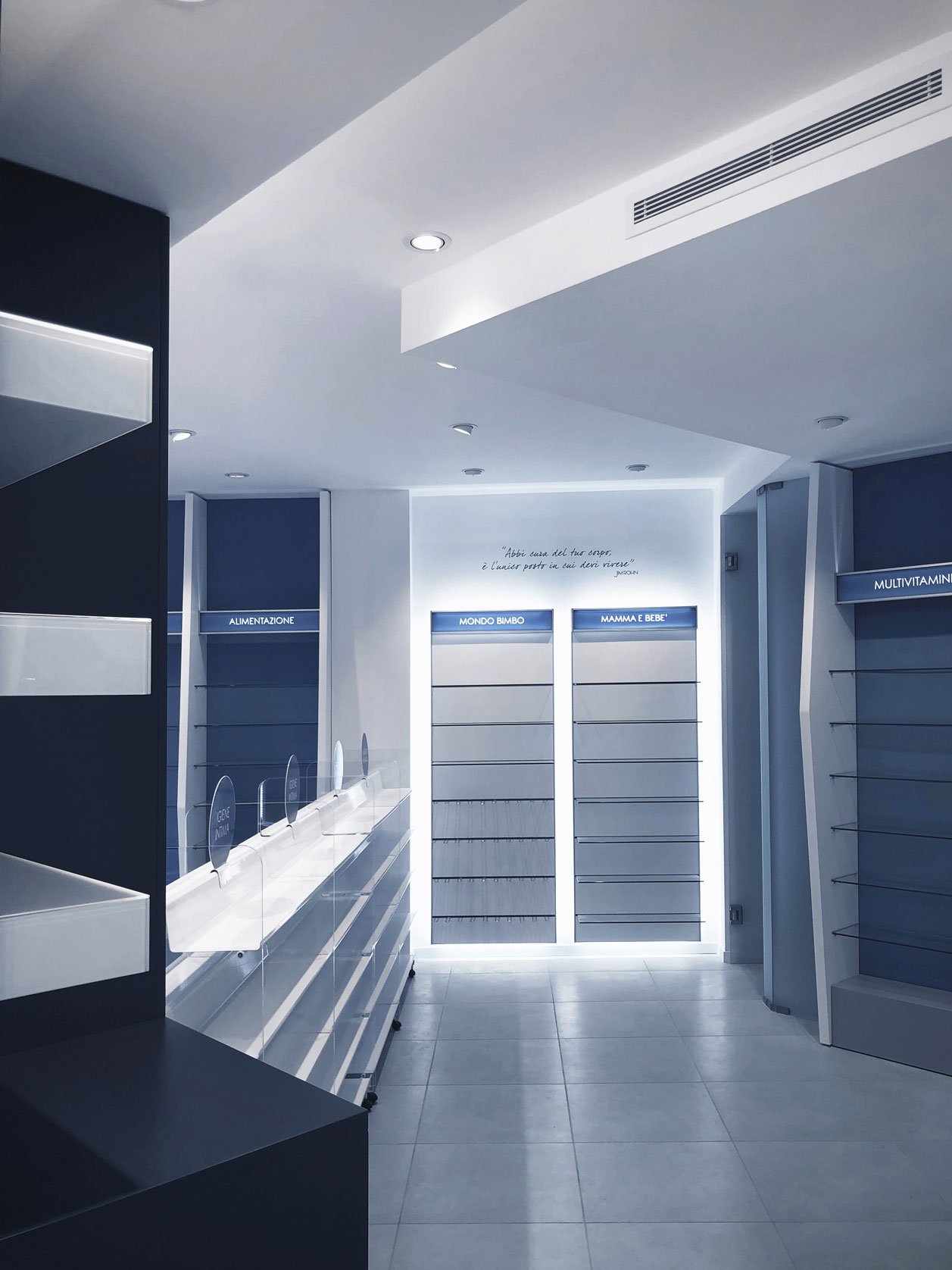 The client’s specific desire to showcase innovative and futuristic forms and, above all, to use unconventional materials in an environment related to health and wellness, gave birth in 2019 to this complete setup of over 150 square meters for a well-known pharmacy on the outskirts of Rome. The main challenge is, as always, to mix different materials not only within the same space, but as different components of the same element. Characteristic features are the polygonal geometries designed with CAD systems and obtained in lacquered MDF with multilayer substructures, the extensive use of painted iron, the combination in the same structures of metal, plastic and glass materials, as well as noble materials such as Corian. The deep lighting study then highlights the cold and almost monochromatic shades, enhancing the overall perception of cleanliness of the entire environment.
