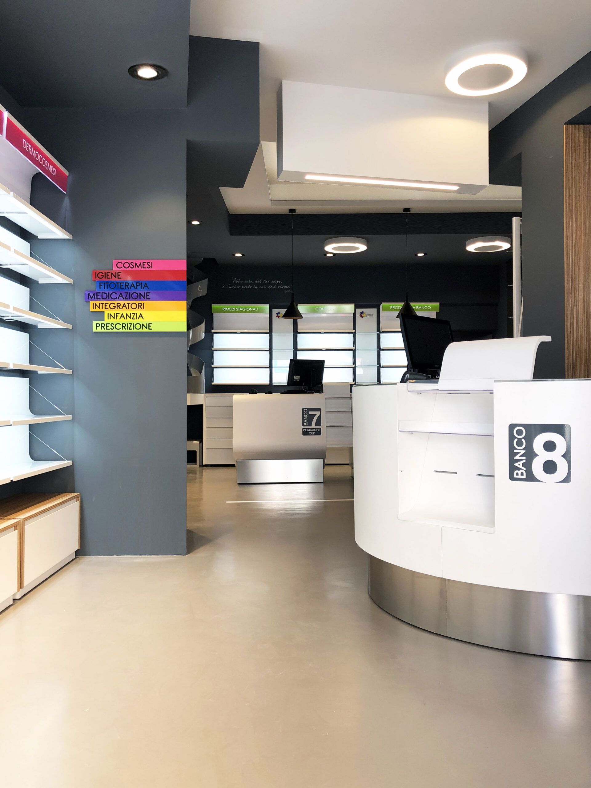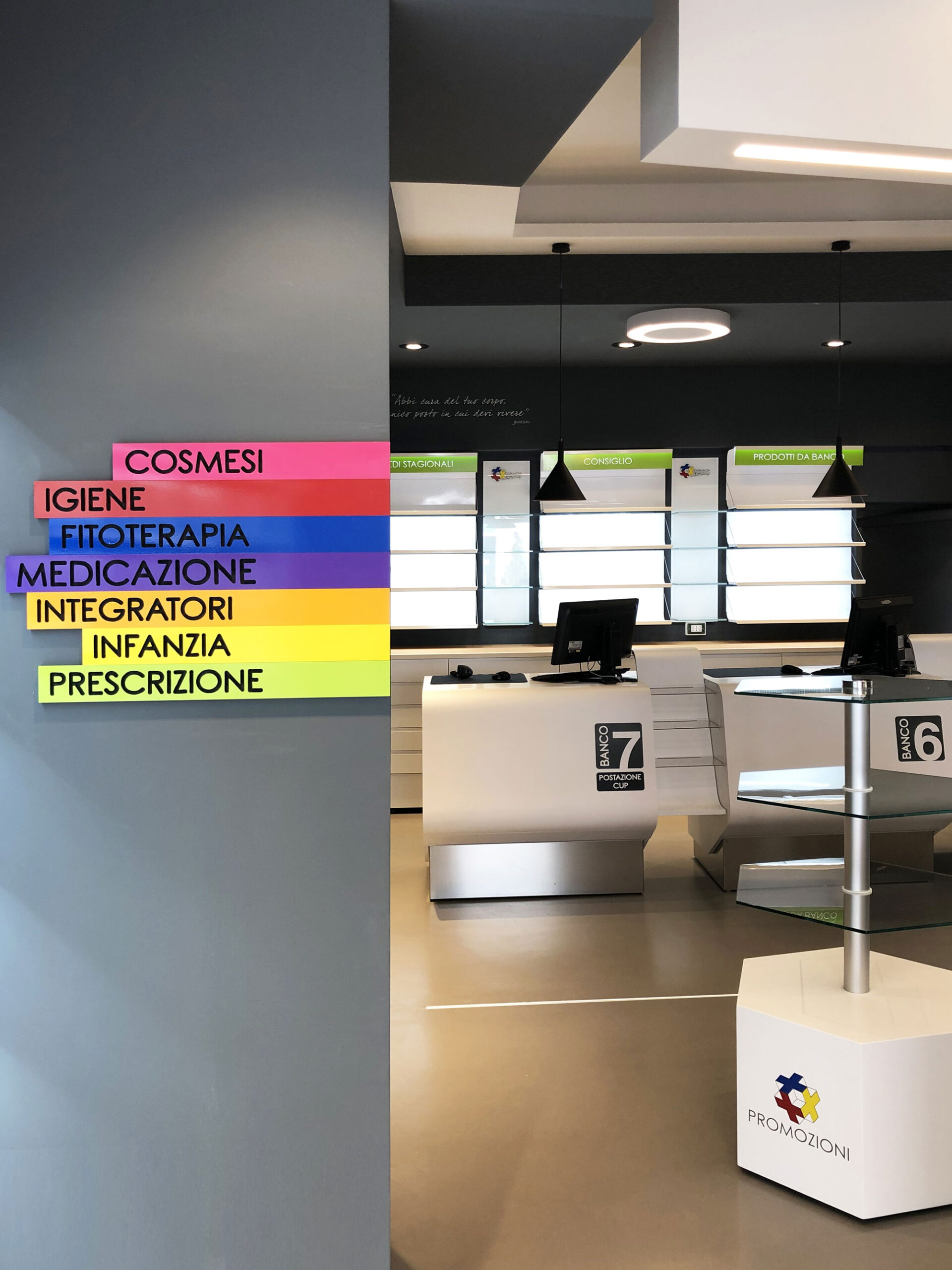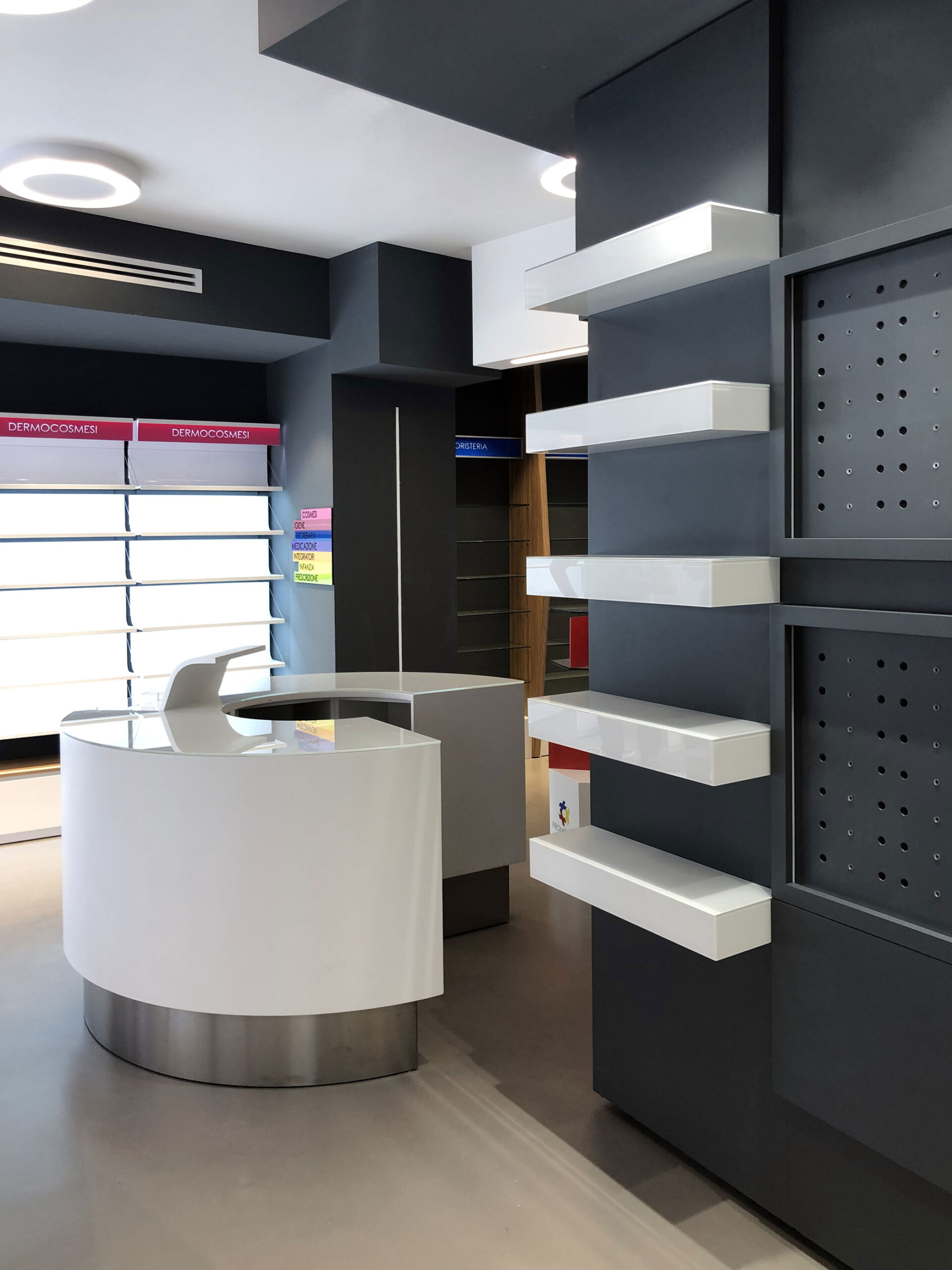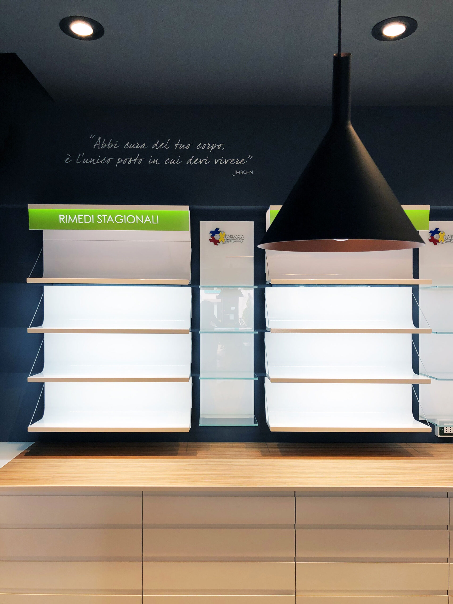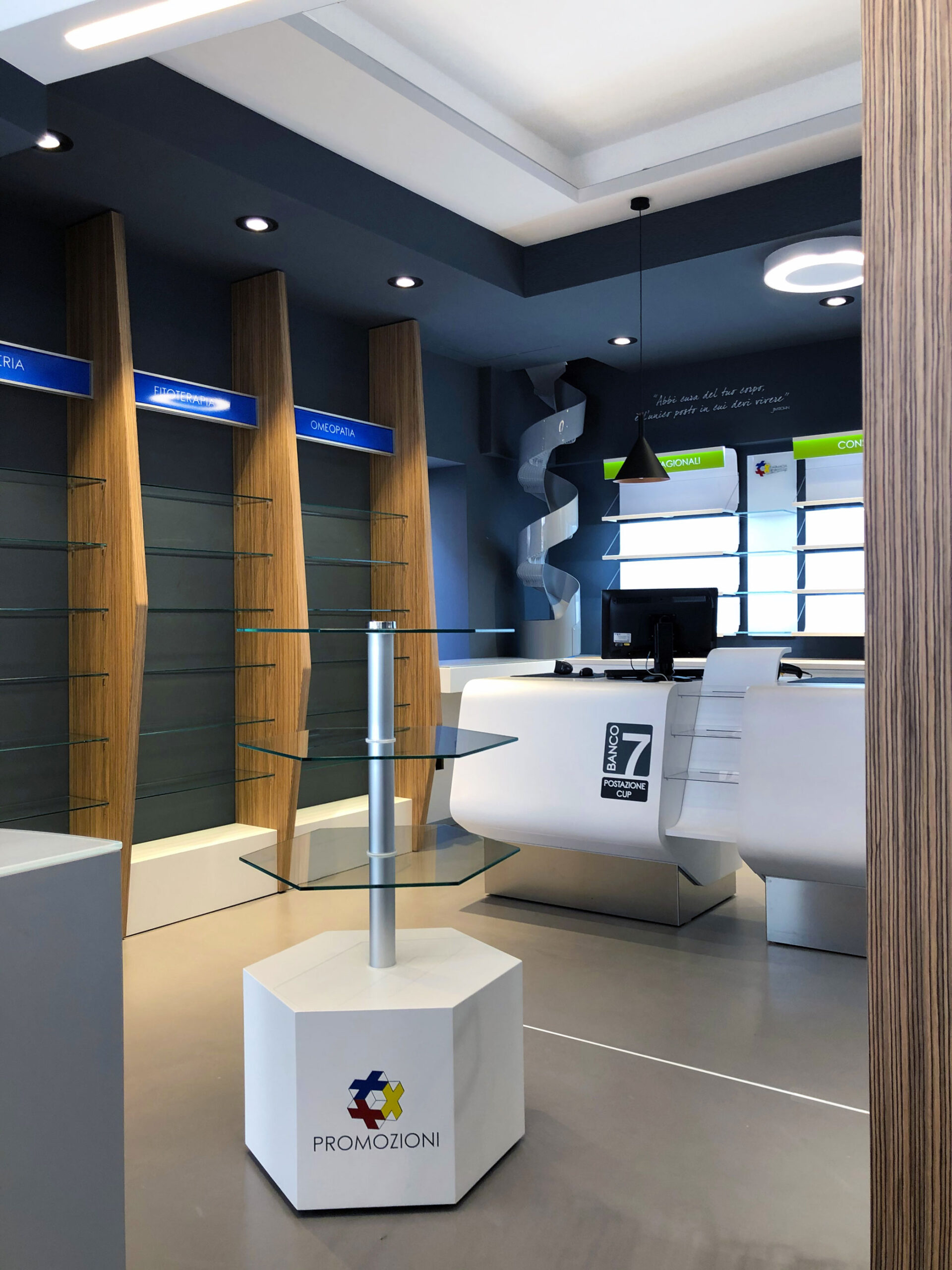 Manufactured and assembled by Omicron in every detail. Creating a setting without using the usual square shapes; visually organizing the displayed products based on their typology and affinity; dividing different rooms, each with characteristic and distinct exhibitions in terms of materials and style to highlight their uniqueness; facilitating the identification of the different arrangements thanks to bright visuals: under these precise requirements, the equipment for a well-known pharmacy in the heart of Taranto was created.